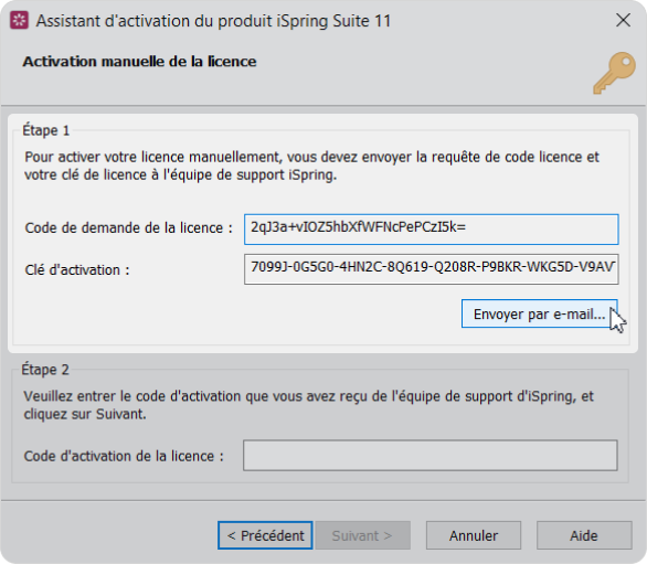 - Copiez le code de demande de la licence et la clé d’activation et envoyez-les à notre service d’assistance clientèle.