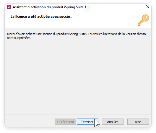 - Votre licence a bien été activée. Cliquez sur Terminer.