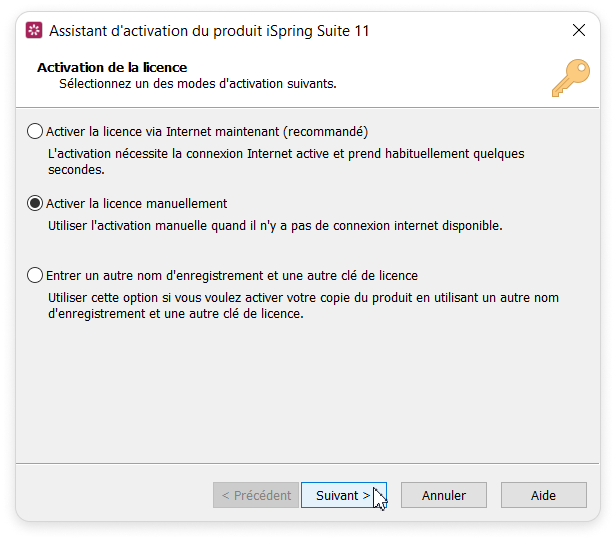 - Sélectionnez Activer la licence manuellement et cliquez sur Suivant.