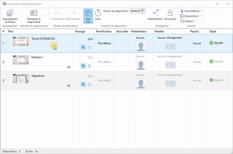 La deuxième façon de choisir un présentateur est de cliquer sur la colonne Présentateur et d’en sélectionner un nouveau. Cette méthode fonctionne si une seule diapositive est sélectionnée. - Pour finir, cliquez sur Sauvegarder et fermer dans la barre d’outils.