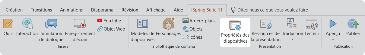 - Cliquez sur le bouton Propriétés des diapositives de la barre d’outils iSpring Suite.