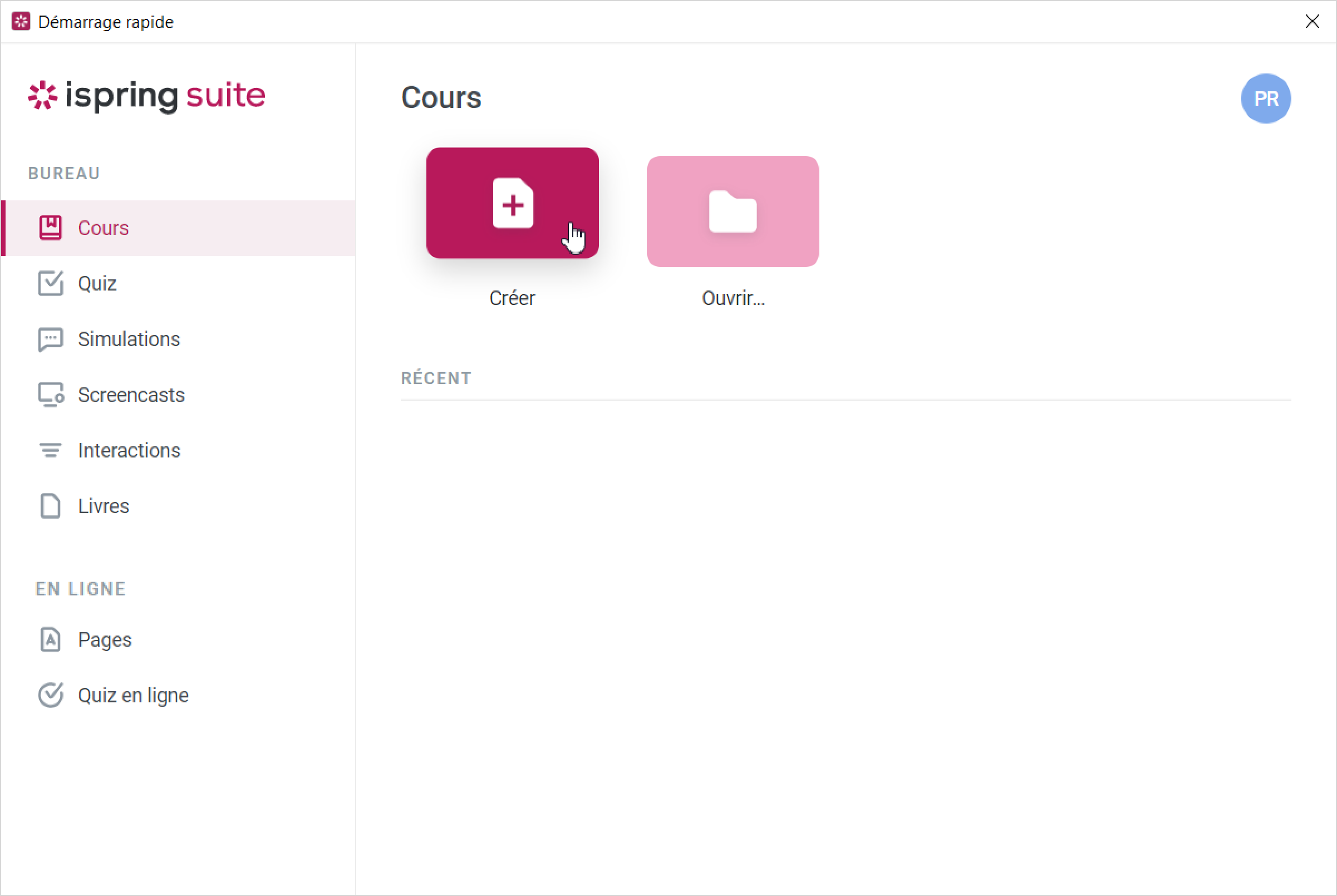 - Lancez iSpring Suite 11, ouvrez l’onglet requis, tel que Cours, par exemple, et cliquez sur Créer.