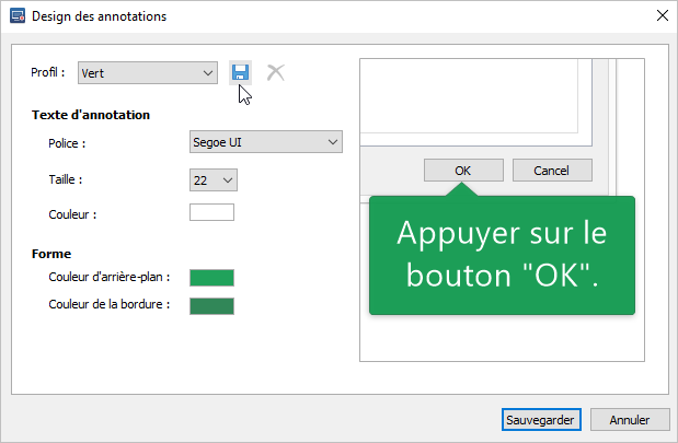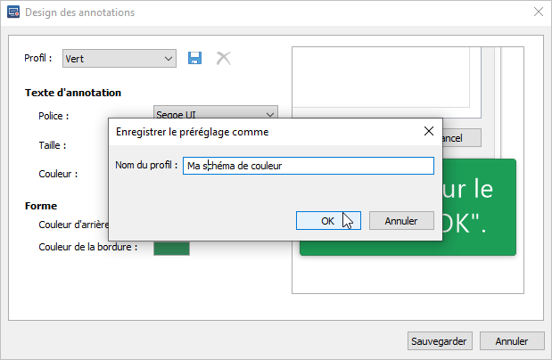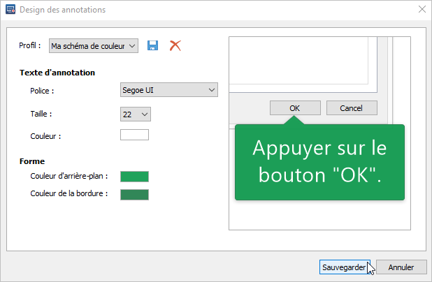 Ici, vous pouvez sélectionner une palette de couleurs prédéfinies dans le menu Profil, configurer le texte et les couleurs des annotations.