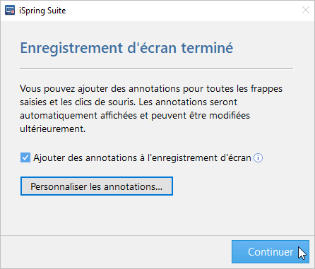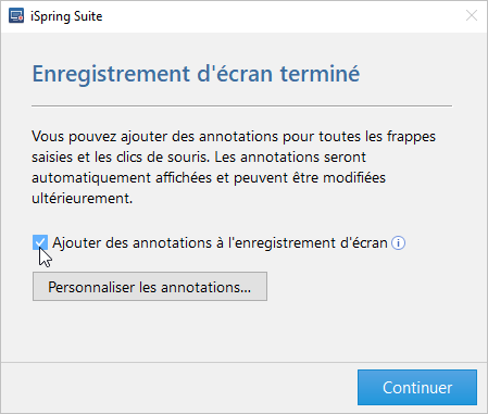 - Une fois l’enregistrement terminé, iSpring Cam Pro s’ouvrira. Dans la fenêtre qui vous avertit que l’enregistrement est terminé, cochez la case Ajouter des annotations à l’enregistrement d’écran.