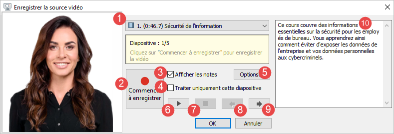 | 1. Liste des diapositives | Choisit la diapositive à partir de laquelle vous allez commencer à enregistrer la narration vidéo. |