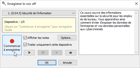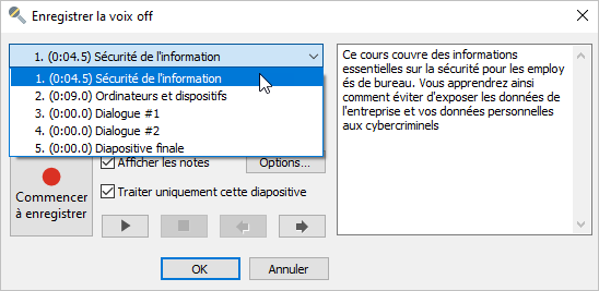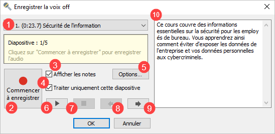 | 1. Liste de diapositives | Choisissez la diapositive à partir de laquelle vous commencerez l’enregistrement de la narration audio. |