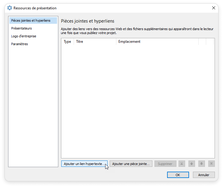 - Dans la fenêtre Ressources de présentation, sélectionnez l’onglet Pièces jointes et hyperliens. Ensuite, cliquez sur Ajouter un lien hypertexte.