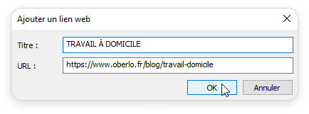 - Pour finir, saisissez le titre du lien Web, insérez l’URL, puis cliquez sur OK.