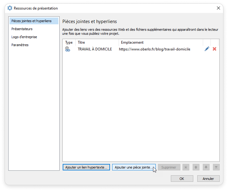 - Dans la fenêtre Ressources de présentation, sélectionnez l’onglet Pièces jointes et hyperliens. Ensuite, cliquez sur Ajouter une pièce jointe.