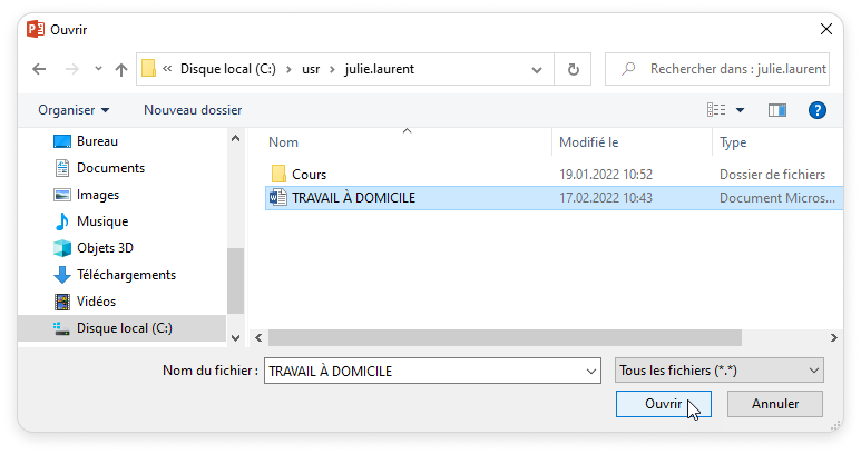 - Localisez le fichier sur votre ordinateur et cliquez sur Ouvrir. Les formats de fichiers suivants sont pris en charge : PDF, DOC, XLS et JPG.