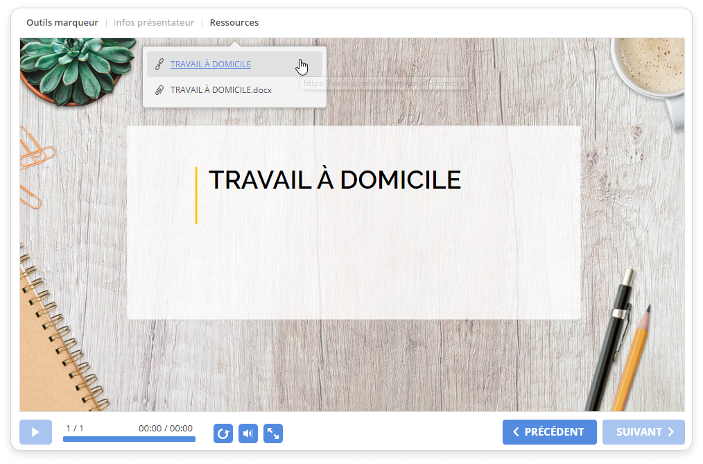 Les apprenants verront les fichiers et les liens lors de la consultation d’un cours si la barre supérieure est activée dans le lecteur. Il leur suffit de cliquer sur l’onglet Ressources et d’ouvrir ou de télécharger les documents.
