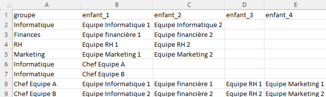 Lors de l’édition du fichier CSV d’import des groupes, vous pouvez définir les sous-groupes en déclarant un ou plusieurs groupes enfants d’un groupe principal.