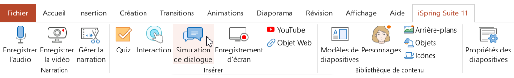 - Sélectionnez la diapositive avec la simulation de dialogue et cliquez sur le bouton Simulation de dialogue dans la barre d’outils.
