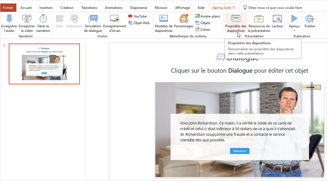 - Ouvrez la diapositive avec la simulation de dialogue et cliquez sur le bouton Propriétés des diapositives dans la barre d’outils.