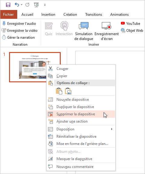 Sous la colonne Objet, ouvrez le menu Dialogue et cliquez sur Supprimer.