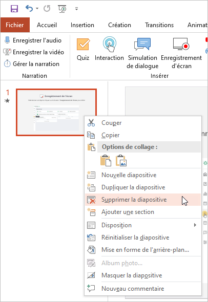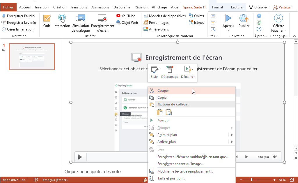 - Cliquez avec le bouton droit de la souris sur la vidéo insérée dans la diapositive et sélectionnez Couper.