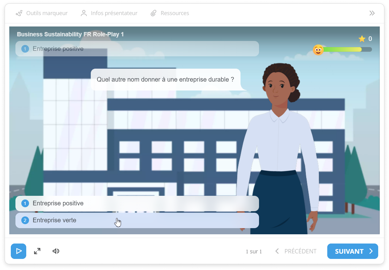 La Bibliothèque de contenu iSpring a bénéficié d’arrière-plans et de personnages dessinés par des artistes professionnels. Ils plongeront vos apprenants dans des scénarios de travail, conféreront une atmosphère de jeu à votre cours et le rendront particulièrement captivant.