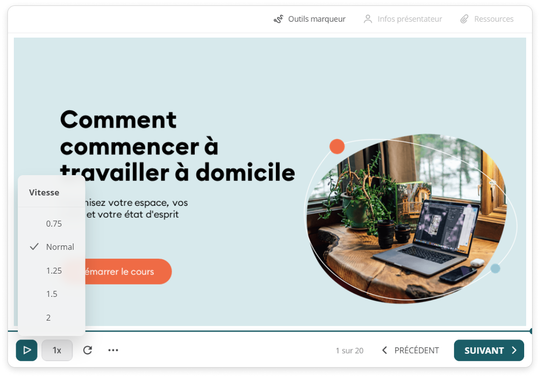 Vos apprenants peuvent ajuster eux-mêmes la vitesse de la formation pour choisir le rythme qui leur convient. Par exemple, ils peuvent regarder une narration sur une diapositive deux fois plus vite – et ceux qui ont besoin de plus de temps peuvent progresser à un rythme plus lent.