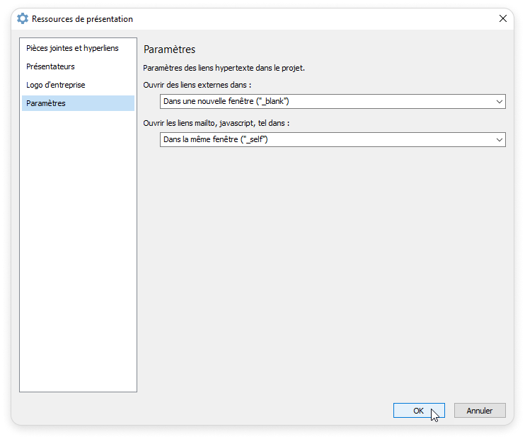- Fenêtre parent (« _parent ») : les liens s’ouvriront dans la fenêtre parent. Cela ne fonctionne que si la page de présentation est située dans une frame.